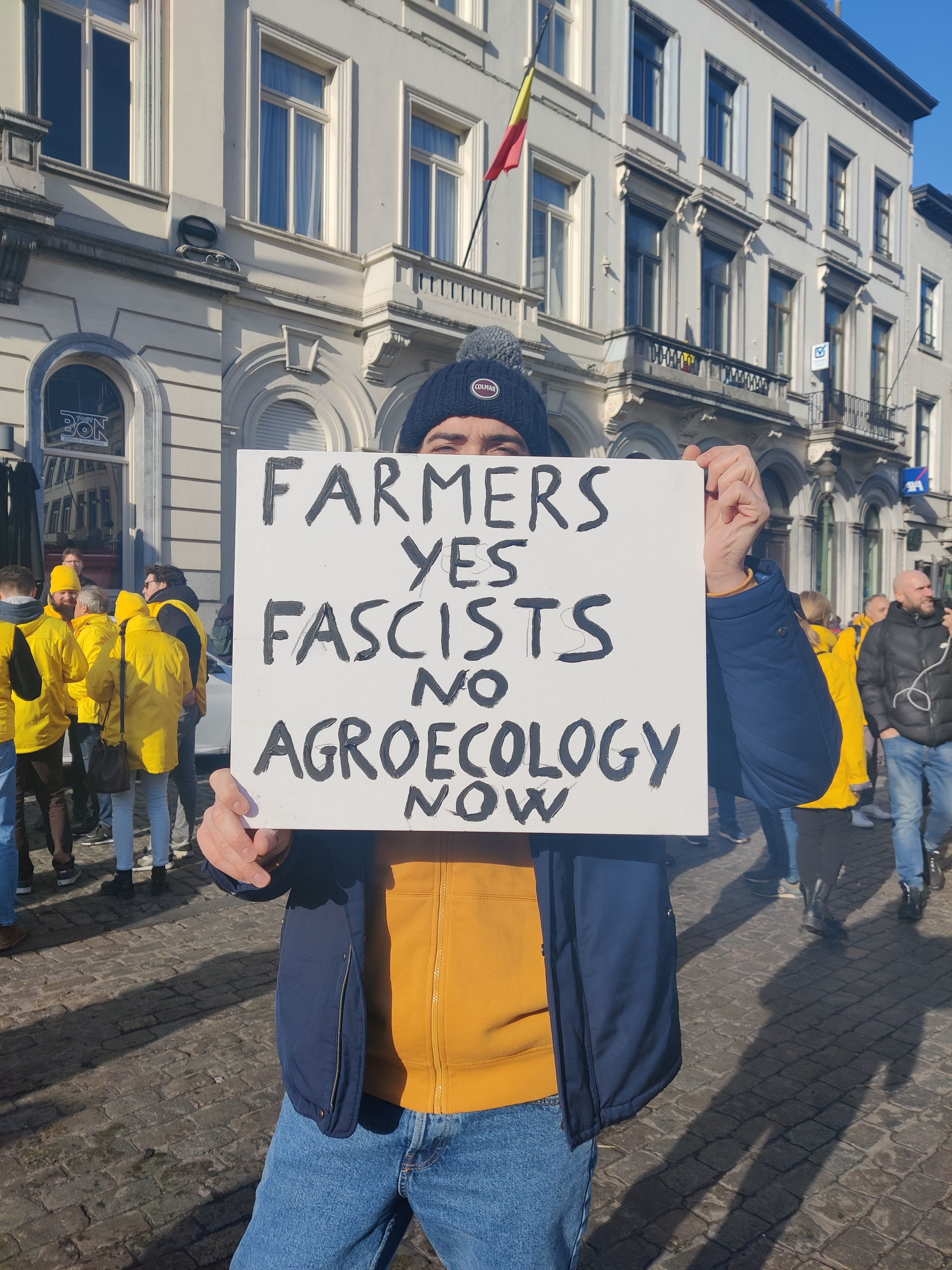 In fact, it was a motley crew of small-scale farmers, peace activists, and environmentalists. Farmers groups with more resources and representing bigger, industrial-scale farmers also turned up. Someone even saw a pro-Russian campaigner.