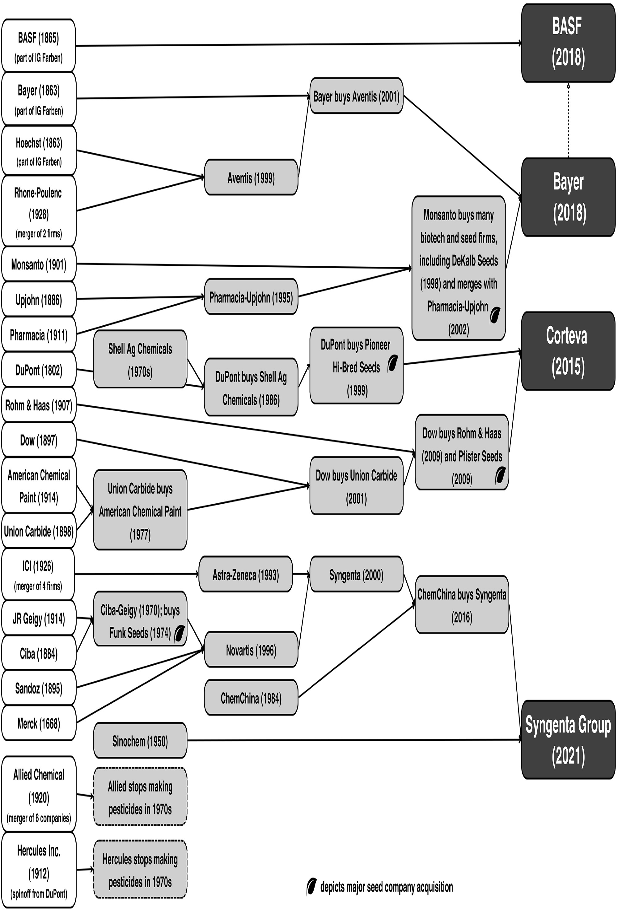 From 2018 to 2020, the top four seed and agrochemical firms - Bayer, Syngenta Group, Corteva, and BASF - controlled between 60 and 70 percent of the global pesticides market and between 50 and 60 percent of the $45 billion global seed market.6 The concentration figures for these sectors are higher than they had been in earlier decades.